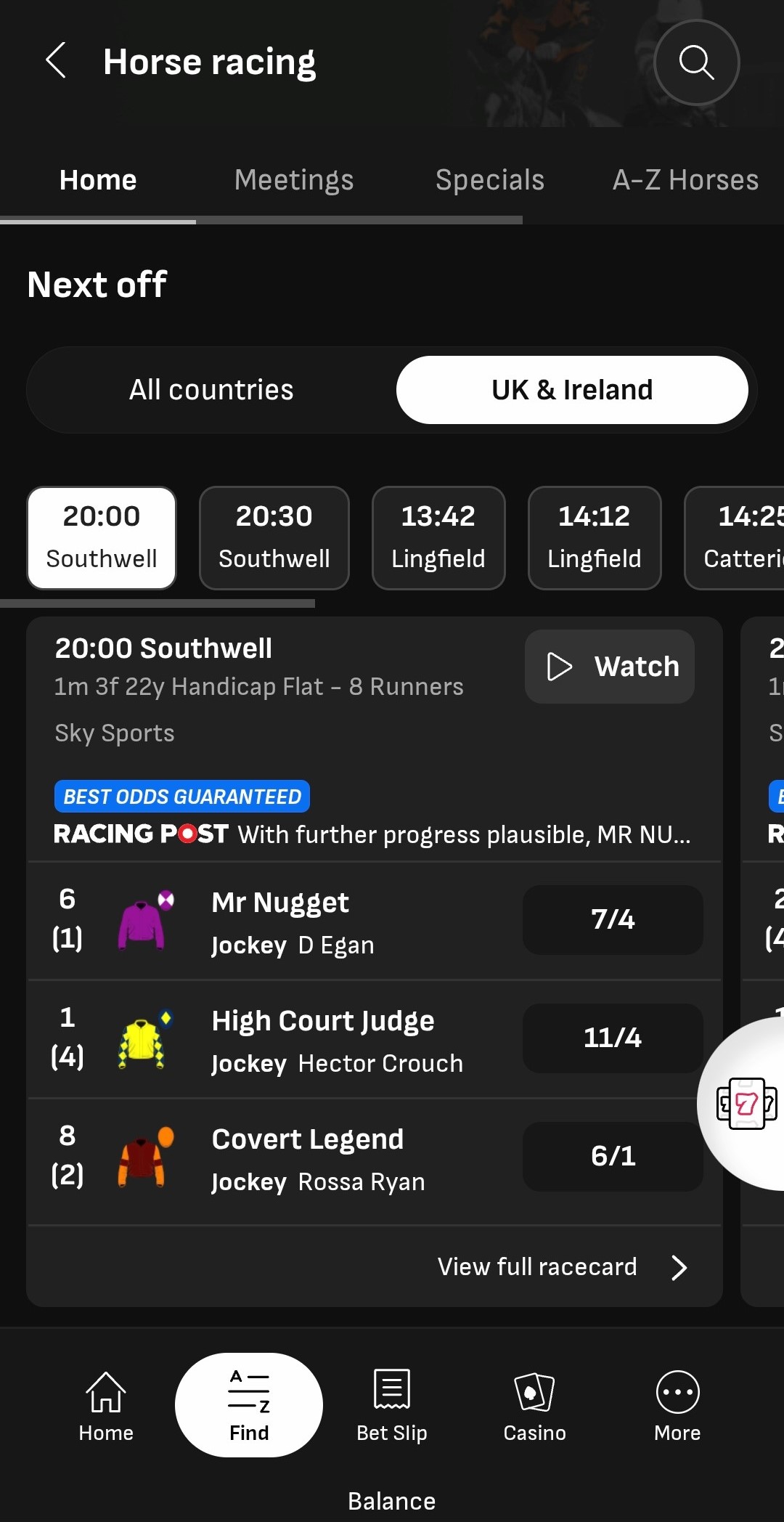 Popular Streaming Questions What races are available for live streaming? We offer live streaming for ALL races in the UK, Ireland, US and South Africa as well as selected meetings from France. How will I know which event has a stream? If you fancy watching the action, you can easily see which events are being streamed. Head to the meet you want, click on the competition and you'll see an icon next to each event you can watch. To save time, you can click this icon to open the stream without needing to open the event. How do I view the live stream? All meetings in the UK, Ireland, US, France and South Africa are free to view. Racing on LiveScore Bet has no stake restrictions - to watch live you just need one of the below: A funded account An unused free bet A live open bet Why can't I view the live stream? Live streaming is accessible on our iOS and Android apps, mobile web and desktop.Should you experience issues using the live streaming service, our dedicated FAQ page will help resolve the most common problems. When will the live video become available? Live streaming typically begins around two minutes before the race begins. The video will then continue to play for around 20 seconds after it has finished.